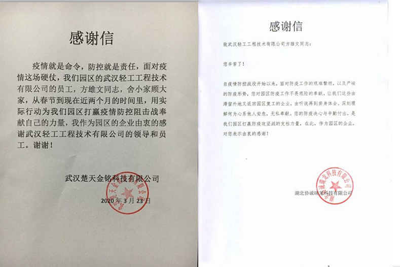 二、方雄文同志除了不忘公司使命,幫助公司盡快復工復產(chǎn)外,還不忘社會責任,積極為工業(yè)園區(qū)協(xié)誠瑞榮公司、楚天金銘科技公司、北方測盟(武漢)公司等11家企業(yè)辦理復工復產(chǎn)手續(xù),并耐心細致的為工業(yè)園區(qū)各企業(yè)共200多人做好各項復工復產(chǎn)所需的政策解讀,做各種力所能及的事情,最后得到大家的高度認可,工業(yè)園區(qū)內(nèi)相關(guān)企業(yè)對其進行了表揚。